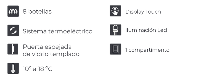 Este modelo es ideal para aquellas personas que quieren almacenar sus vinos en las condiciones óptimas de guarda, pero que no cuenta con amplios espacios en su hogar. Es ideal para vinos tintos, y dadas sus dimensiones puede ir perfectamente sobre un mueble o una mesada. La cava T8FLAT cuenta con capacidad para 8 botellas estándar de 750ml y 30cm de largo. Es silenciosa, y su luz interna led de color azul aporta sofisticación y elegancia al ambiente donde la luzca, sin dañar su colección de vinos.